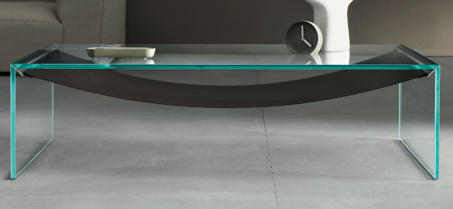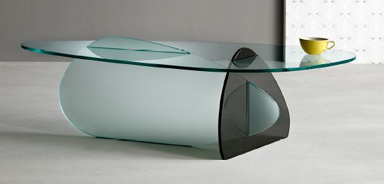 Three Glasses Plates That seem to cross each other form this low table Made From Three Different Kind Of Glass . Smoked Frosted And Transparent. Top Available In Two Sizes